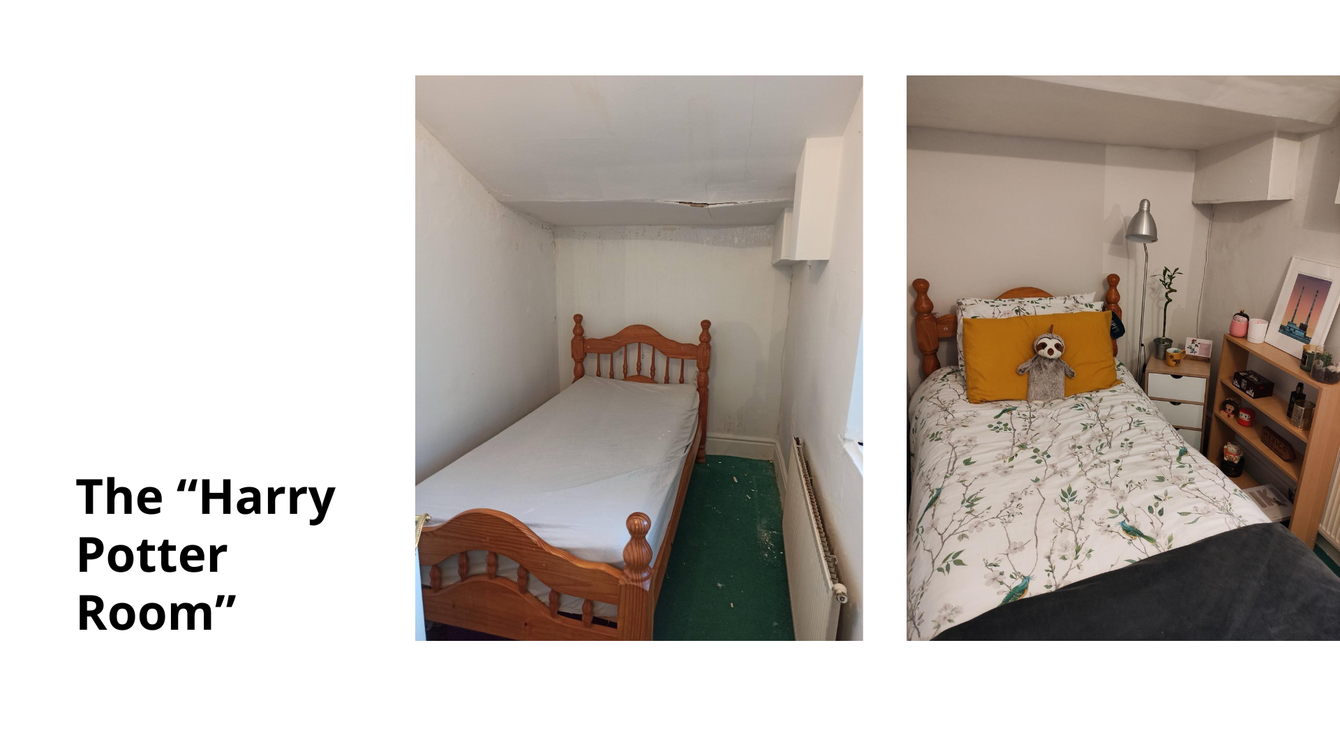 I started off living in what I now call my “Harry Potter room”: a small space under the stairs, with damp walls, broken heating, and a tired old carpet.